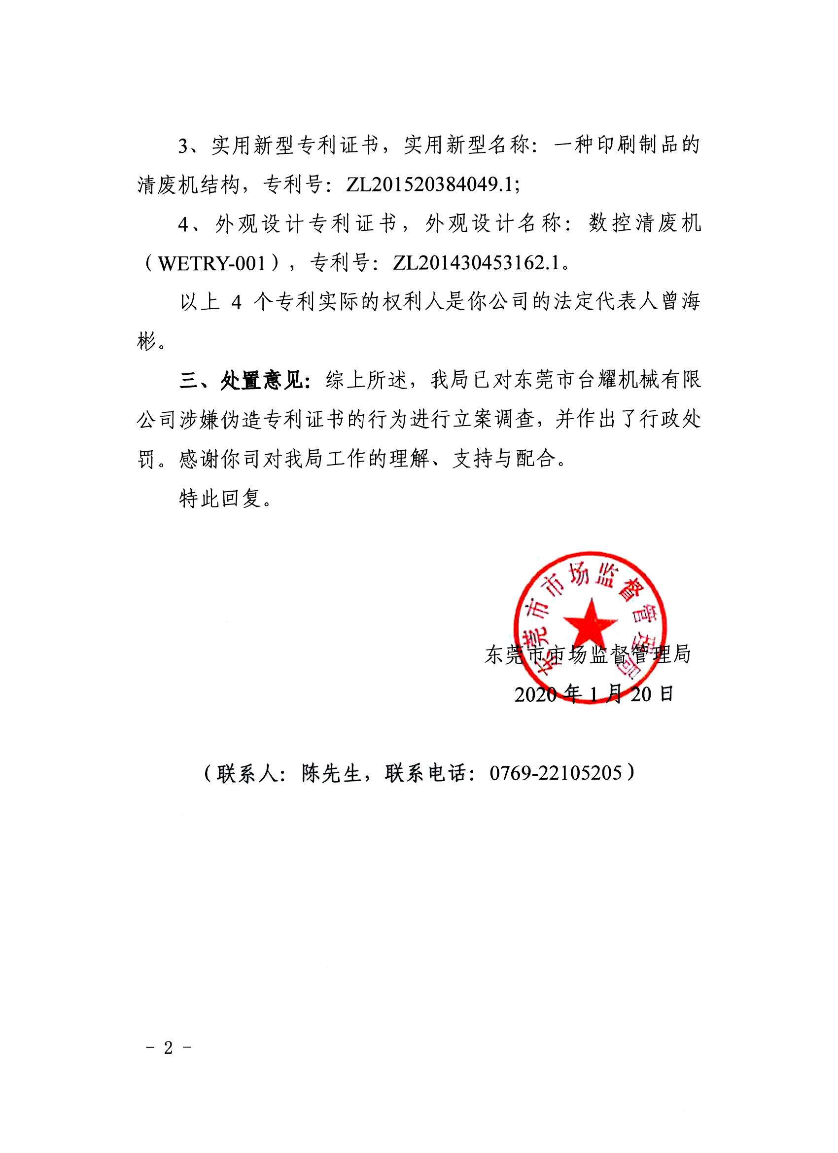 2020年1月20號,東莞市市場監(jiān)督管理局對東莞市臺耀機械有限公司涉嫌偽造專利證書的行為進行立案調(diào)查,并作出了行政處罰。我司后續(xù)將繼續(xù)追究東莞臺耀機械有限公司的侵權(quán)法律責(zé)任。