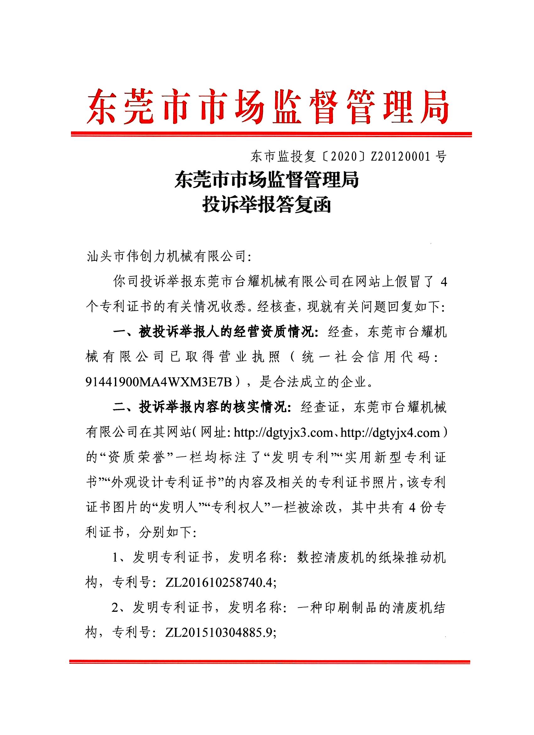 2020年1月20號,東莞市市場監(jiān)督管理局對東莞市臺耀機械有限公司涉嫌偽造專利證書的行為進行立案調(diào)查,并作出了行政處罰。我司后續(xù)將繼續(xù)追究東莞臺耀機械有限公司的侵權(quán)法律責(zé)任。